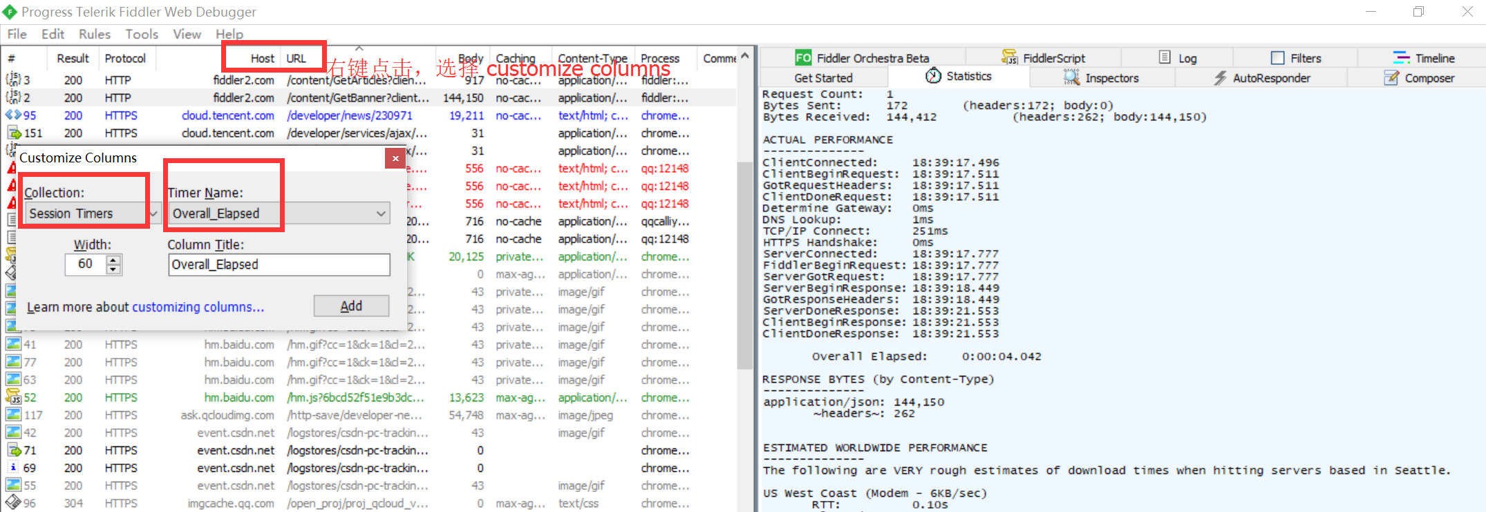 在URL那一栏右键点击,选择customize columns,然后在弹框中选择session timers、overall_elapsed