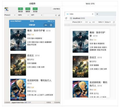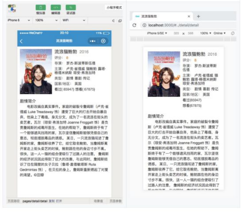下面是豆瓣电影小程序 DEMO 和生成的 Web页面的对比: