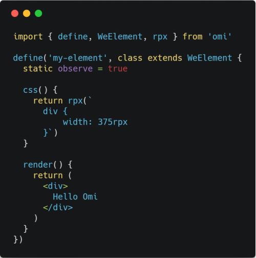 小程序支持rpx布局,Omi也增强了CSS, 支持基于750屏幕宽度,支持 rpx 布局。比如定义一个半屏宽度的 div: