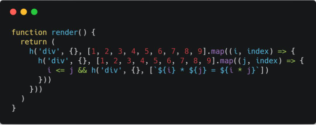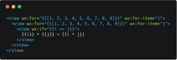 微信小程序和 Omi 框架都是使用 Web Components(CustomElements 和ShadowDom)渲染组件,以搭积木的方式搭建 Web 页面,小程序在定制的 WebView 中渲染组件,Omi 在 PC、Mobile、TV 等现代浏览器环境渲染组件,Omi 使用 JSX 作为 UI 表达式,小程序使用模板引擎,JSX 是图灵完备,可以表达一切模板引擎。比如举个99乘法表的例子: