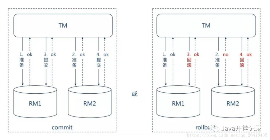 TM(事务管理器)分别向多个RM(本地资源管理器)发送准备提交指令(如果此时一方发送失败,表示该事务失败);RM执行完本地业务后分别响应TM(如果此时一方返回NO或者异常表示事务失败)