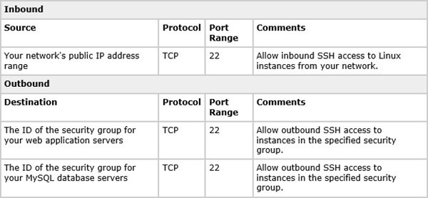 The SSH bastion is a single Amazon EC2 instance used to provide secure administrator access and hosting only a Secure Shell (SSH) service. This allows the administrator to connect to TCP port 22 from the Internet or a specified range of Internet addresses. After connecting to the SSH bastion, the administrator can then connect to the web application server and MySQL database server instances. In case of a DDoS attack against this port, only the SSH service would be impacted. This prevents an attacker from using this port to impact the availability of your web application. To minimize the possibility of unauthorized access, only your network’s public IP range should be allowed to communicate with the SSH bastion security group. The following table provides an example of rules you can use to configure the SSH bastion security group.