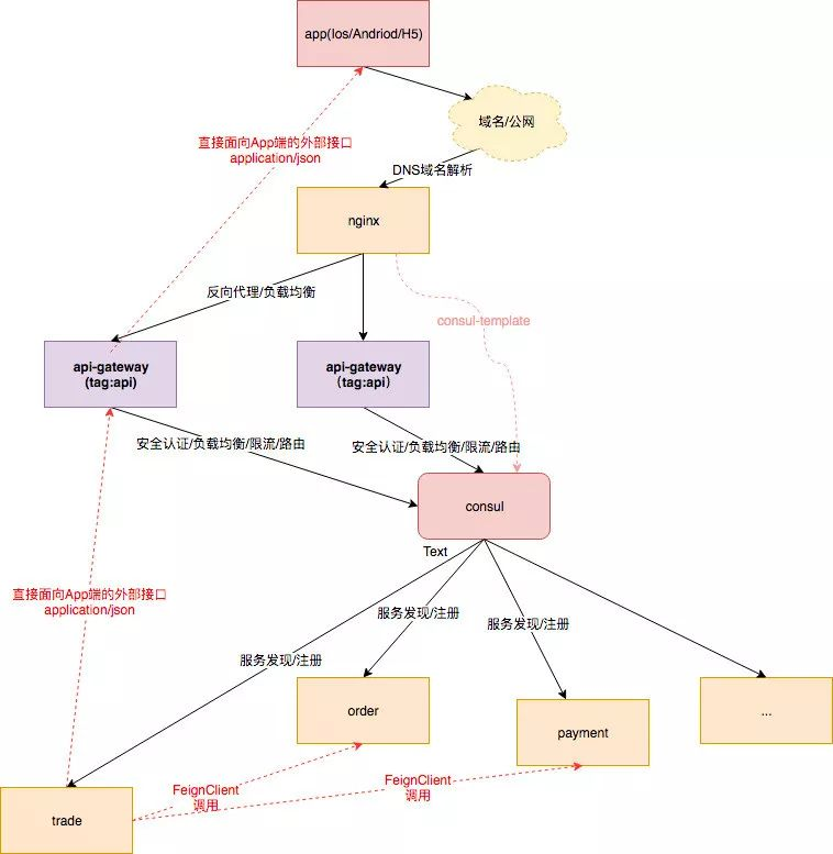 这里需要说明的是,在基于SpringCloud的微服务架构中,所有服务都是通过如consul或eureka这样的服务中间件来实现的服务注册与发现后来进行服务调用的,只是面向外部的服务接口会通过网关服务进行暴露,面向内部的服务接口则在服务网关进行屏蔽,避免直接暴露给公网。而内部微服务间的调用还是可以直接通过consul或eureka进行服务发现调用,这二者并不冲突,只是外部客户端是通过调用服务网关,服务网关通过consul再具体路由到对应的微服务接口,而内部微服务则是直接通过consul或者eureka发现服务后直接进行调用。