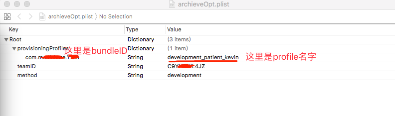 -exportOptionsPlist archieveOpt.plist这里的archieveOpt.plist是我们在工程目录下新建的.plist文件,该文件指明打包的类型和teamid