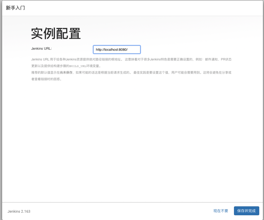 创建一个jenkins账户密码就可以了,然后进入jenkins URL配置页面,这里配置的URL就是局域网内可以使用的链接访问Jenkins的地址,比如因为我的ip地址是192.168.10.30, 且为固定ip, 所以我配置的是 https://192.168.10.30:8080/,当然这里也可以暂时不配置,在配置里面也可以进行配置