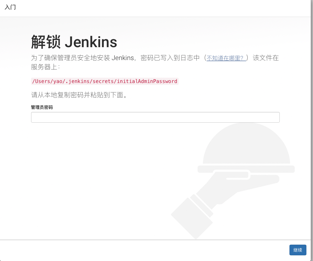 在浏览器中输入http://localhost:8080,首次安装应该会出现如下界面,这里需要你去找到Jenkins的初始密码,执行cat /Users/yao/.jenkins/secrets/initialAdminPassword 获取原始密码
