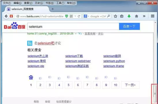 通过浏览器打开百度进行搜索,搜索的一屏无法完全显示将会出现滚动条。这个时候就可以通过JavaScript 代码控制滚动条在任意位置,需要改变的就是scrollTop 的值。通过execute_script()方法来执行这段JavaScript 代码。