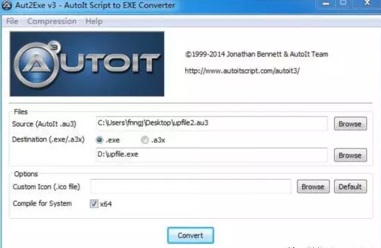 点击“Browse”选择upfile.au3 文件,点击“Convert”按钮将其生成为upfile.exe 程序。