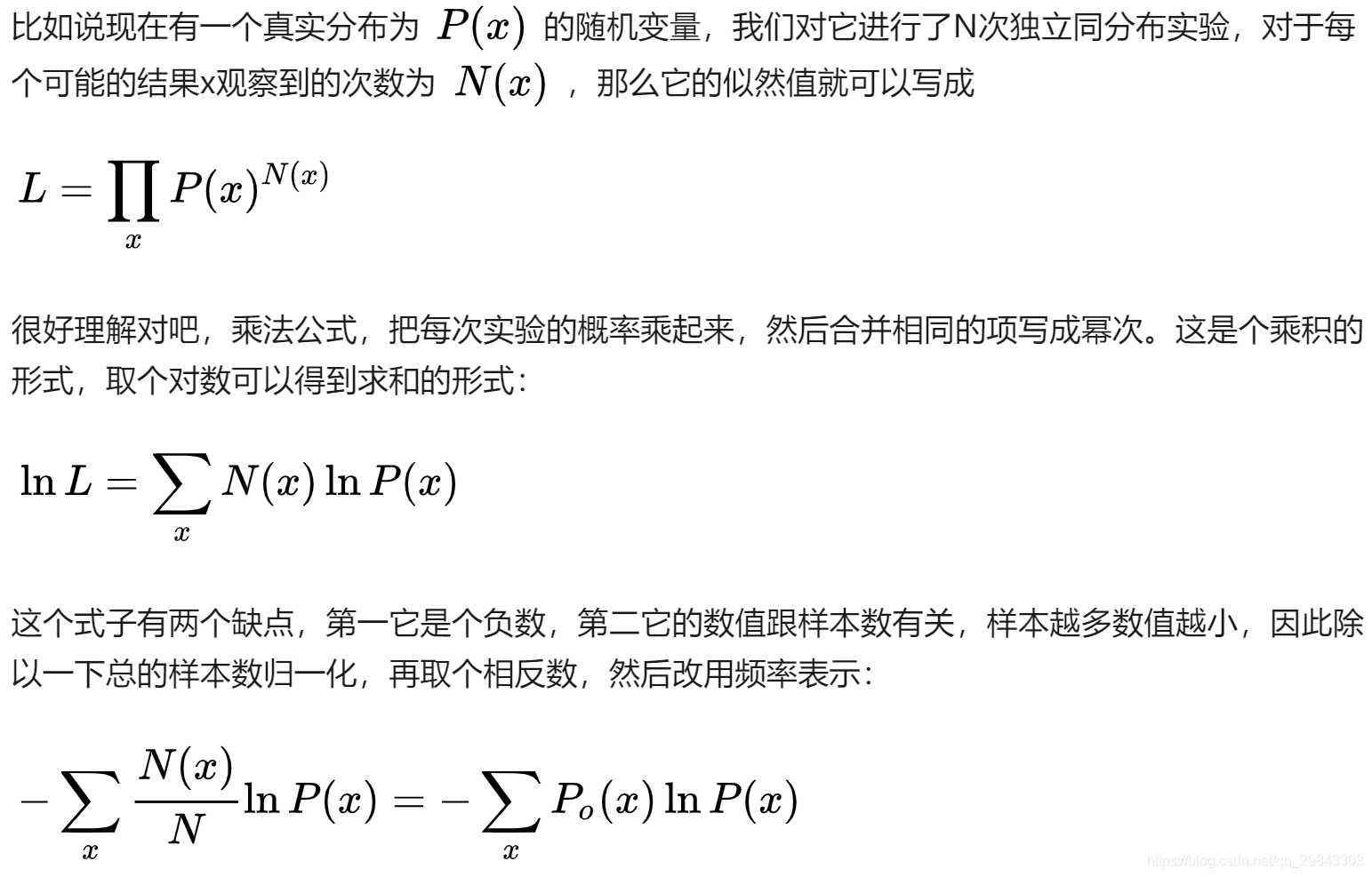 把对数里面那个分布理解为真实的随机变量分布,而将对数外面那个理解为观察到的频率,那么这就是最大似然估计(最大可能性)