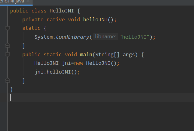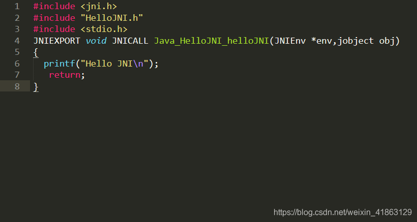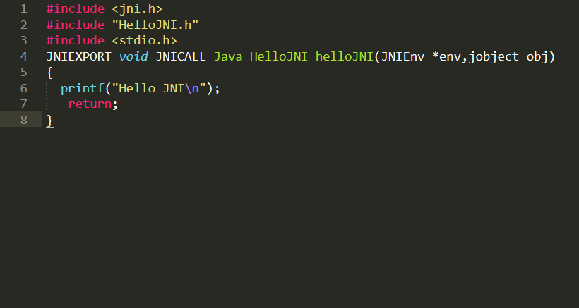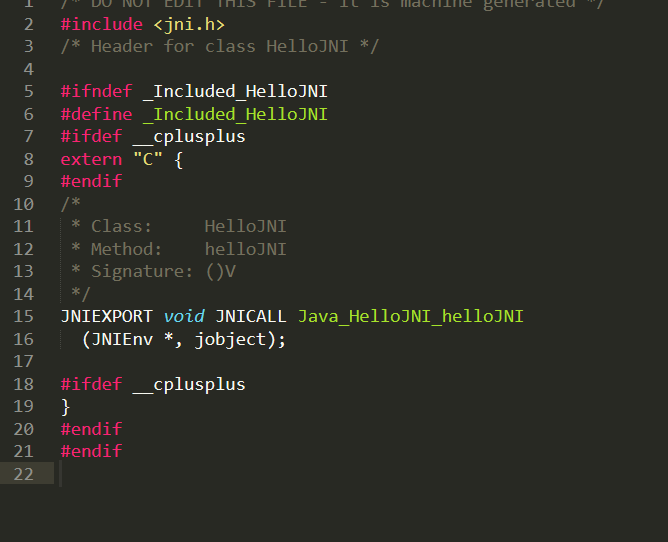 使用这个头文件,做一个动态链接库。具体做法就是新建一个.c,包含这个头文件,实现HelloJNI方法:
