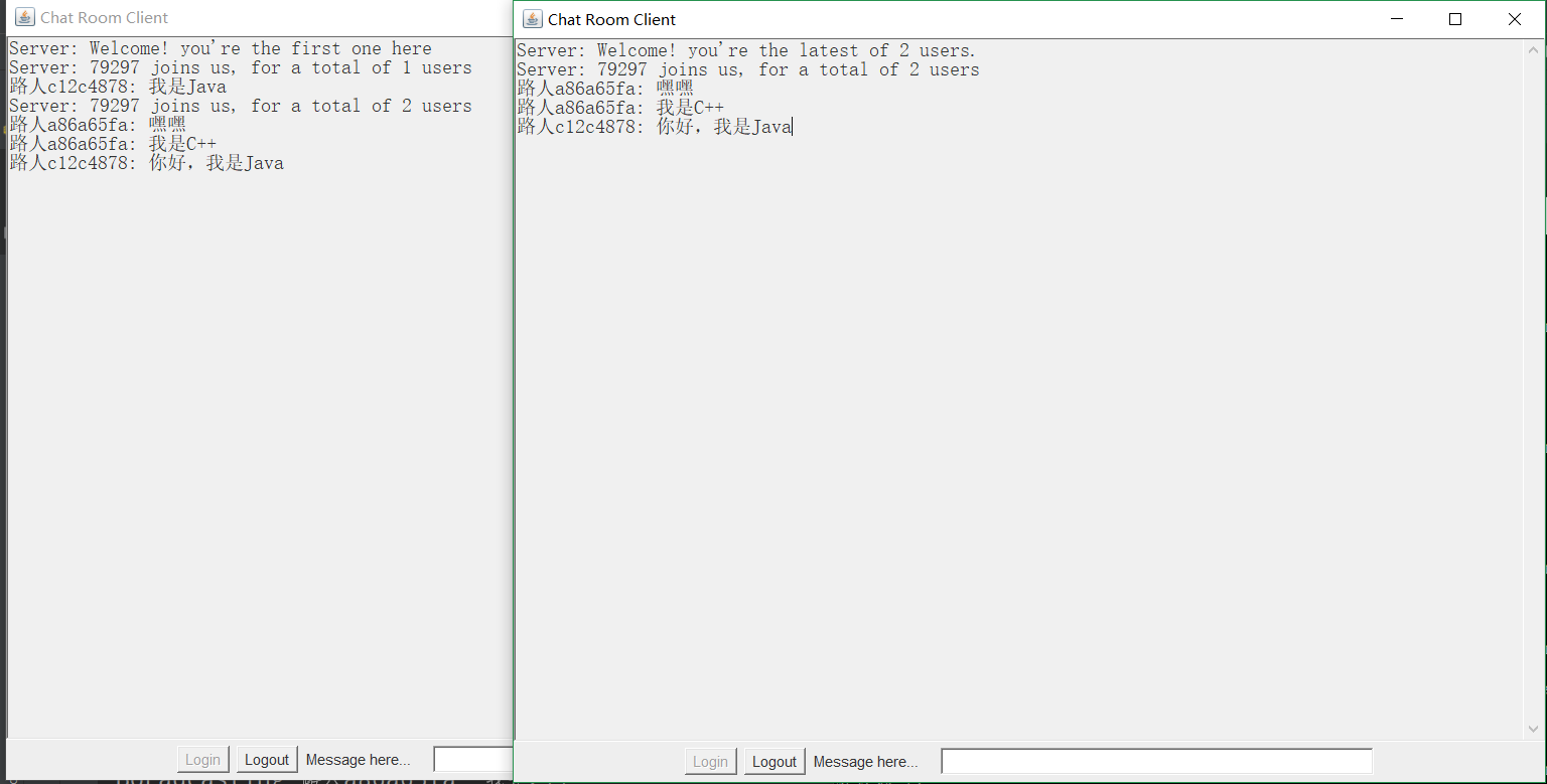二、本地多客户端调试效果图:(为了方便本地调试区分不同客户端,这里把用户名都设置为了“路人xxxx”,可以调整为用户名)