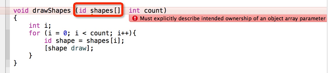 3、Must explicitly describe intended ownership of an object array parameter(Objective-C基础教程第三章中最后一个实例练习时出错)