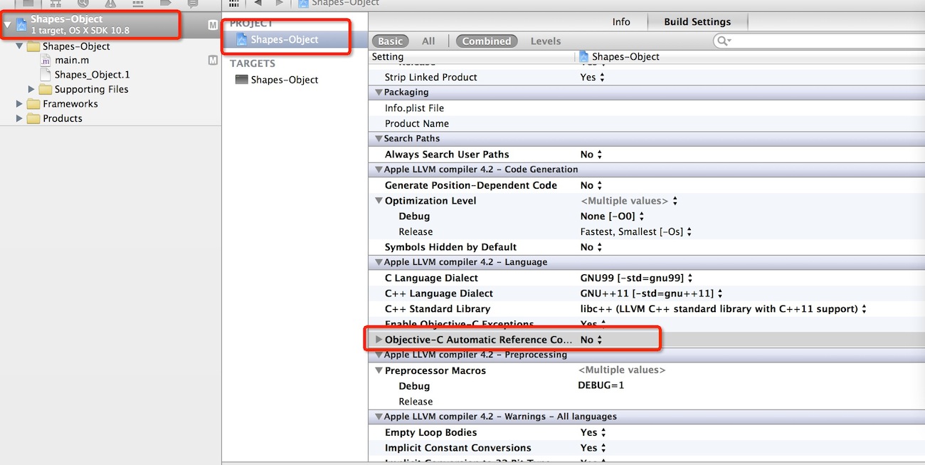 进行到第三章最后一个实例时,cmd+r运行会报错:Must explicitly describe intended ownership of an object array parameter。如果你看到了这个错误信息,你可以选中左边的项目名,然后再选中右边的PROJECT-->Apple LLVM compiler 4.2 - Language-->Objective-C Automatic Reference Counting,它本来的值是Yes,将它的值改为No(不自动管理内存),就可以正常编译运行了(如下截图所示)。