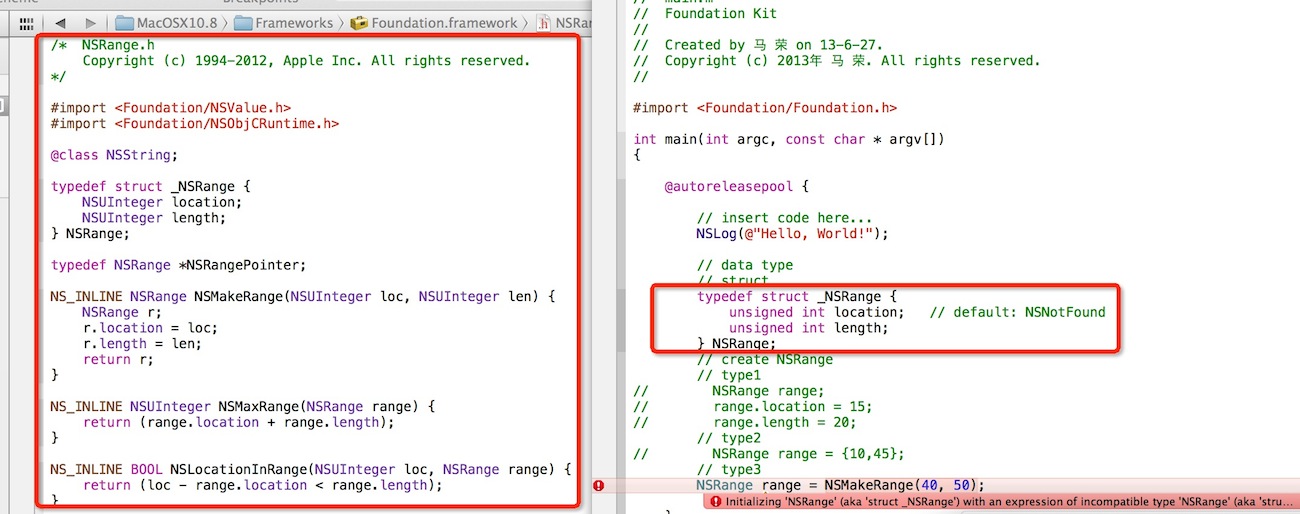 7、在敲NSRange这章内容时,遇到一个纠结的问题,通过{5,5}或者NSMakeRange(5,5)给NSRange对象赋值会报错