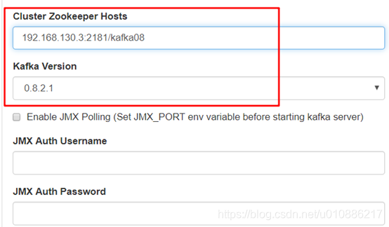 填写集群信息,关键是一下两个点:kafka的topic在zookeeper中位置,以及kafka版本。JMX复选框,如果在kafka中没有配置则不要勾选;其他默认即可。