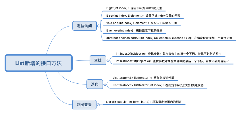1、List接口继承了Collection接口的方法,还另外定义了一些顺序表操作的方法。通过这些方法,可以实现定位访问、查找、链式迭代和范围查看等。