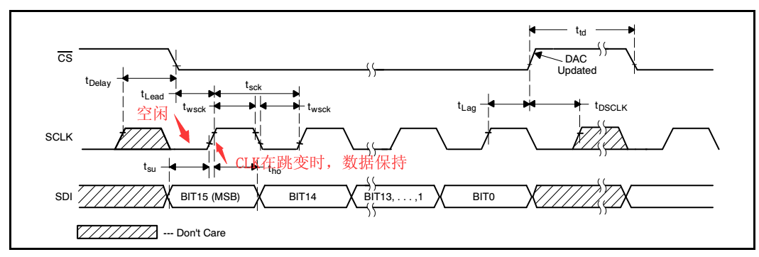 注意:DAC8830是支持16bit数据传输,且高字节在前的,所以需要将SPI的数据长度配置为16bit,将传输的FirstBit设置为SPI_FirstBit_Msb。同时关于CPOL和CPHA这两项一定不能配置错误,否则可能会导致数据解析出现异常,这两项要根据DAC8830提供的时许图来进行判断。CPOL意味着CLK在空闲状态时低还是高,而CPHA,则是来判断这个数据是在第一个边沿采集还是第二个边沿采集,通过查看DAC8830时序图,我们可以判断,空闲状态下的CLK为低电平,而采样在高电平,如下所示: