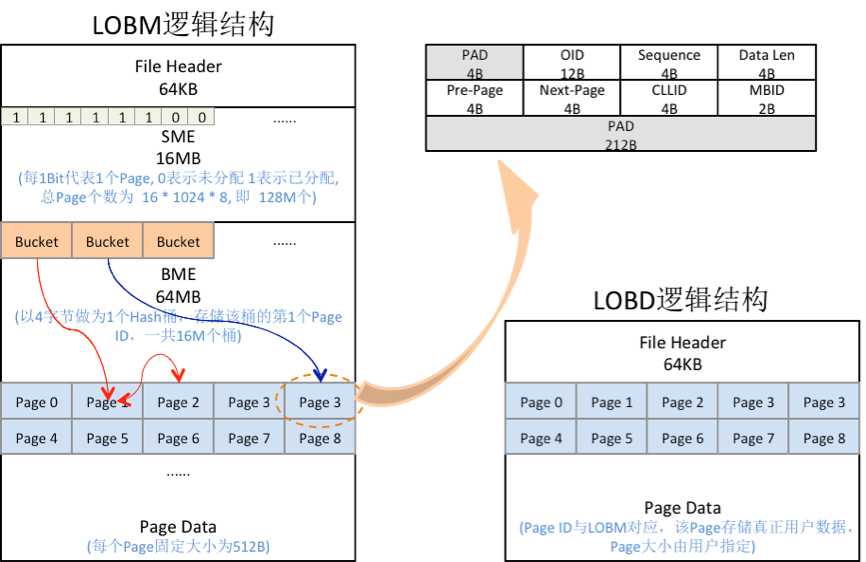 在巨杉数据库中,LOB存储结构分为元数据文件(lobm)与数据文件(lobd)。其中,元数据文件存储整个LOB数据文件的元数据模型,包括每个页的空闲状况、散列桶、以及数据映射表等一系列数据结构。而数据文件则存储用户真实数据,数据头之后所有数据页按照page size进行切分,每个数据页不包含任何元数据信息。
