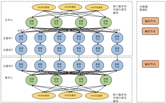 从多活架构的角度看,巨杉数据库都秉承着计算存储分离的设计思路,因此其SQL解析与执行器往往与数据存储和事务控制分别运行在不同的进程中。在这种情况下,利用数据库自身分布式与三副本复制的特性,将数据打散放置在多个数据中心内,每个数据中心配置本地SQL服务节点,从应用程序的角度看不需要关注底层数据库的主从架构,仅需要通过JDBC连接到本地的SQL服务节点进行读写操作即可。在这种架构下,每个SQL节点完全对等,并均可以处理读写操作。所有的事务控制、一致性控制、锁等待等机制都由底层的分布式数据库直接提供。