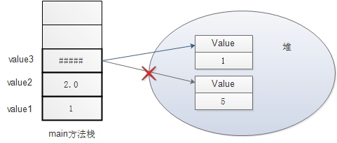 上面的例子中,我们先来看一下main方法中的几个final修饰的数据,在给value1赋初始值之后,我们无法再对value1的值进行修改,final关键字起到了常量的作用。从value2我们可以看到,final修饰的变量可以不在声明时赋值,即可以先声明,后赋值。value3时一个引用变量,这里我们可以看到final修饰引用变量时,只是限定了引用变量的引用不可改变,即不能将value3再次引用另一个Value对象,但是引用的对象的值是可以改变的,从内存模型中我们看的更加清晰:
