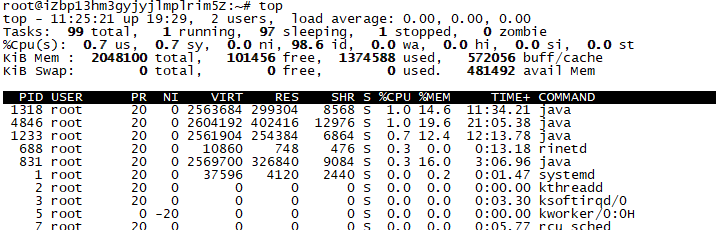 | 11:25:21 up 19:29 | 当前时间和系统运行时间,格式为时:分。这里表示已经运行了19小时29分 |