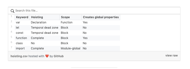 下表概述了与JavaScript中使用的不同关键字声明的变量对应的提升行为和使用域: