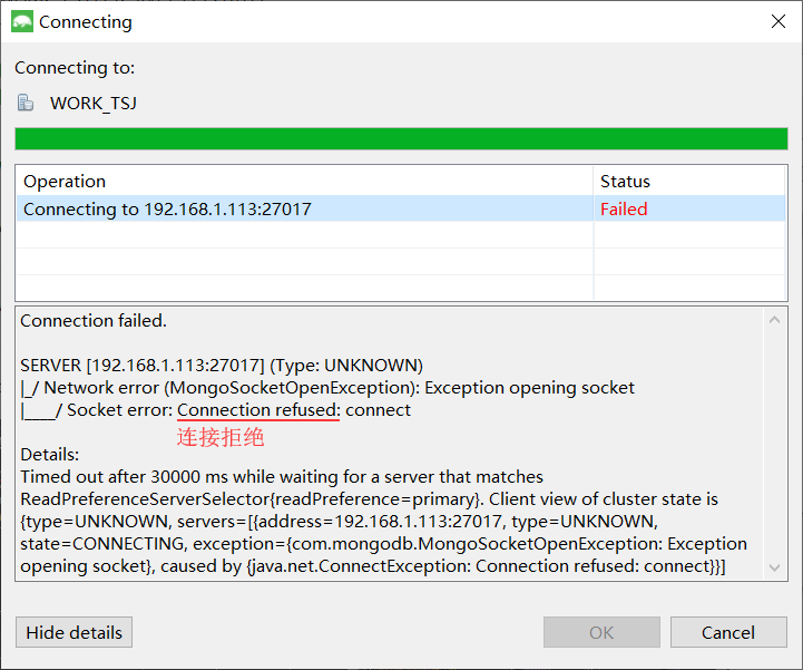 远程连接mongodb失败,报错Exception opening socket