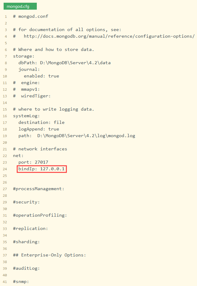 mongodb.cfg配置文件中bindIp是127.0.0.1,127.0.0.1只允许本地连接,不接受远程连接mongodb
