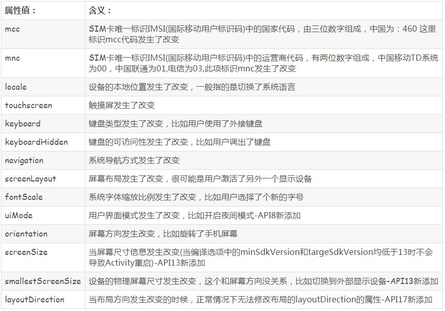 那么,如果想要在异常情况下不让Activity重新创建的话,可以设置android:configChanges属性,它的值跟含义如图所示: