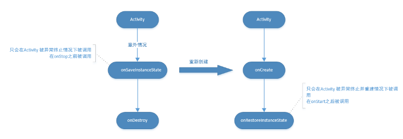 相比正常的生命周期,出现了两个不一样的方法,onSaveInstanceState()和onRestoreInstance()。onSaveInstanceState()只在异常终止时执行,在onStop()前调用,保存当前Activity的状态(视图结构,比如TextView的名字内容和选中位置等)。而onRestoreInstance()则是在Activity重新创建时进行恢复这些状态数据,在onStart()后调用。onSaveInstanceState()和onRestoreInstance()用法如下: