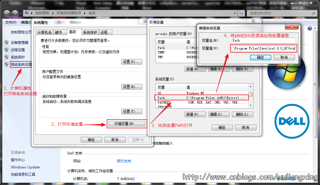 接下来设置相应的环境变量,设置方法为:在桌面右击【计算机】--【属性】--【高级系统设置】,然后在系统属性里选择【高级】--【环境变量】,然后在系统变量中找到“Path”变量,并选择“编辑”按钮后出来一个对话框,可以在里面添加上一步中所安装的JDK目录下的bin文件夹路径名,我这里的bin文件夹路径名是:C:\Program Files\Java\jre1.8.0_92\bin,所以将这个添加到path路径名下,注意用英文的分号“;”进行分割。如图所示: