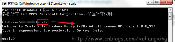 下载得到Scala的msi文件后,可以双击执行安装。安装成功后,默认会将Scala的bin目录添加到PATH系统变量中去(如果没有,和上面JDK安装步骤中类似,将Scala安装目录下的bin目录路径,添加到系统变量PATH中),为了验证是否安装成功,开启一个新的cmd窗口,输入scala然后回车,如果能够正常进入到Scala的交互命令环境则表明安装成功。如下图所示: