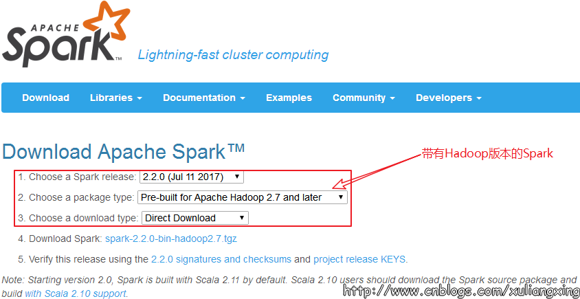我们到Spark官网进行下载:http://spark.apache.org/ ,我们选择带有Hadoop版本的Spark,如图所示: