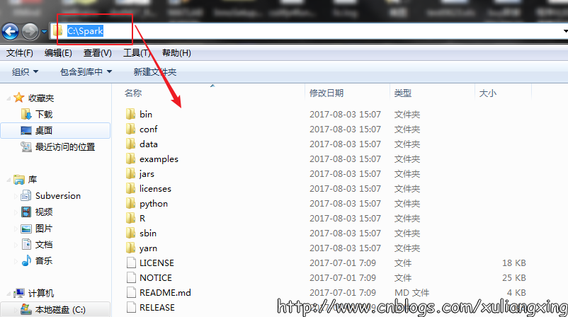 这里使用的是Pre-built的版本,意思就是已经编译了好了,下载来直接用就好,Spark也有源码可以下载,但是得自己去手动编译之后才能使用。下载完成后将文件进行解压(可能需要解压两次),最好解压到一个盘的根目录下,并重命名为Spark,简单不易出错。并且需要注意的是,在Spark的文件目录路径名中,不要出现空格,类似于“Program Files”这样的文件夹名是不被允许的。我们在C盘新建一个Spark文件夹存放,如图所示: