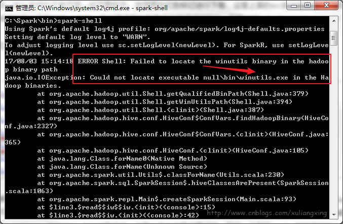 正常情况下是可以运行成功并进入到Spark的命令行环境下的,但是对于有些用户可能会遇到空指针的错误。这个时候,主要是因为Hadoop的bin目录下没有winutils.exe文件的原因造成的。这里的解决办法是:
