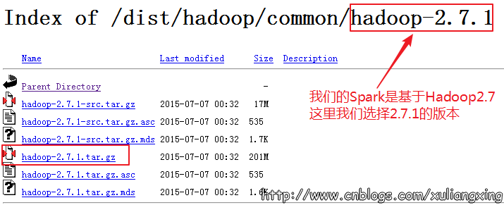 在Hadoop Releases里可以看到Hadoop的各个历史版本,这里由于下载的Spark是基于Hadoop 2.7的(在Spark安装的第一个步骤中,我们选择的是Pre-built for Hadoop 2.7),我这里选择2.7.1版本,选择好相应版本并点击后,进入详细的下载页面,如下图所示: