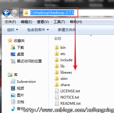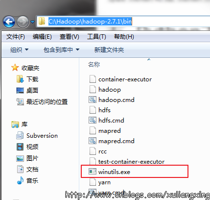 将下载好winutils.exe后,将这个文件放入到Hadoop的bin目录下,我这里是C:\Hadoop\hadoop-2.7.1\bin。