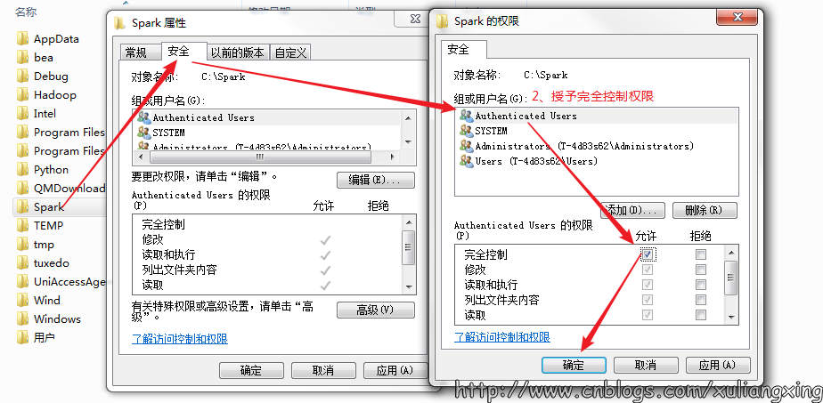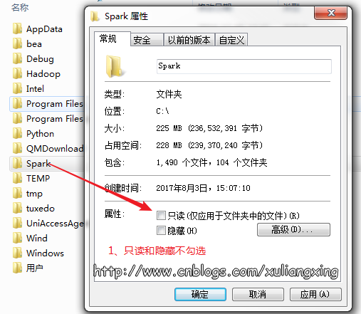 存放Spark的文件夹不能设为只读和隐藏,如图所示: