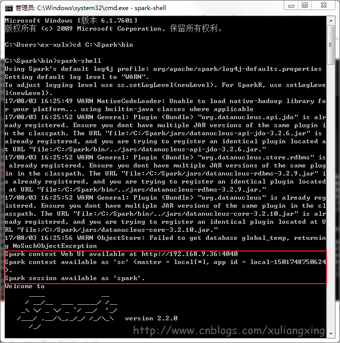 经过这几个步骤之后,然后再次开启一个新的cmd窗口,如果正常的话,应该就可以通过直接输入spark-shell来运行Spark了。正常的运行界面应该如下图所示: