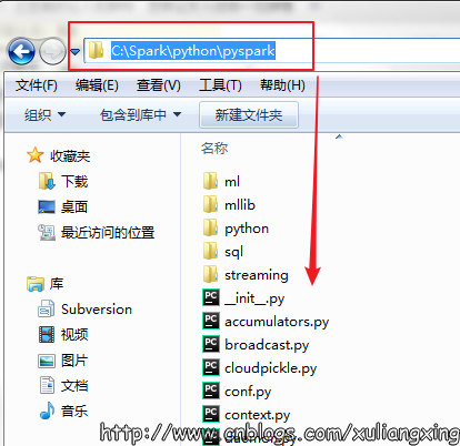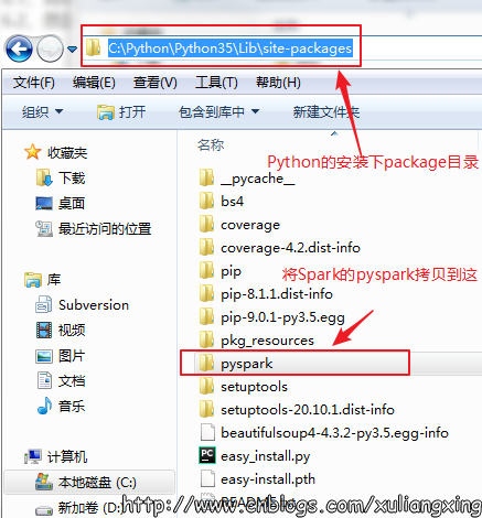 1、将spark目录下的pyspark文件夹(C:\Spark\python\pyspark)复制到python安装目录C:\Python\Python35\Lib\site-packages里。如图所示
