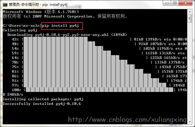 2、然后使用cd命令,进入目录D:\python27\Scripts,运行pip install py4j安装py4j库。如图所示: