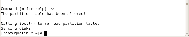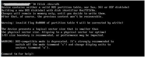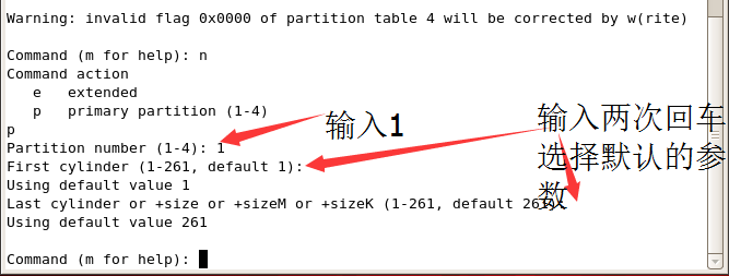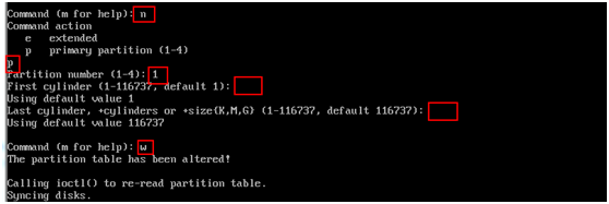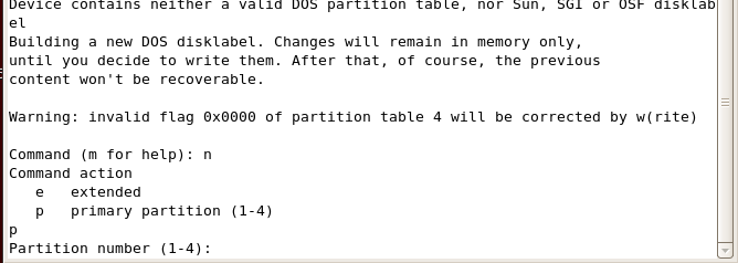 3.输入fdisk /dev/sdb :对已经选中的硬盘进行编辑。选中硬盘时候输入n(增加一个新的分区),之后输入选输入p(选则为主分区),其次在输入1,之后按回车选择默认(即将一个2G的空间全部给这个分区了),最后输入“w”,将分区保存并退出