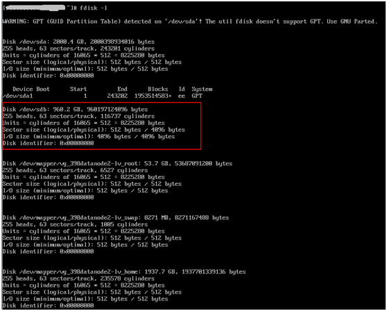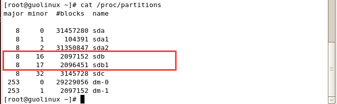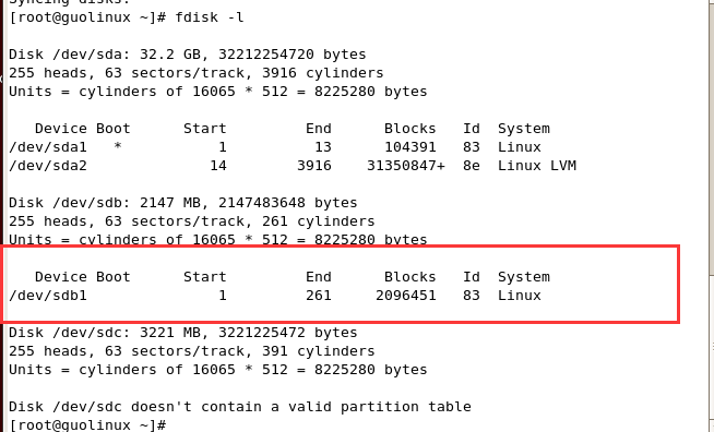 4.之后输入fdisk -l ,再次查看分区是否完成分配。红框中的表示分配成功