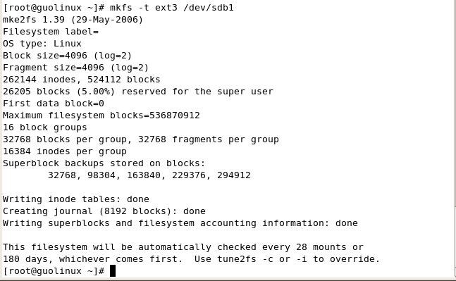 6.格式化新加的分区表 mkfs -t ext3(表示格式化后的文件系统) /dev/sdb1