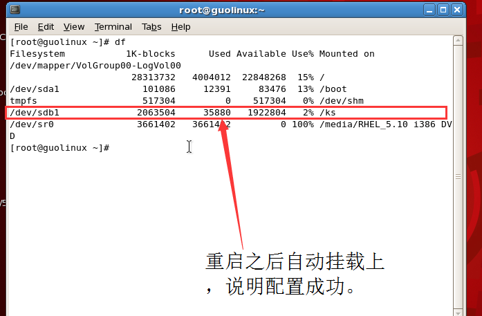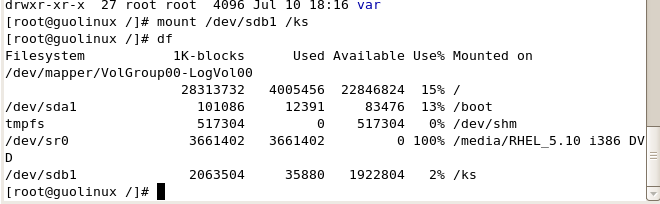 7.格式化之后,将硬盘挂载到想要挂载的位置下(假设挂载到/ks下),则需要创建/ks目录(mkdir /ks),mount /dev/sdb1 /ks,之后查看是否挂载成功 df