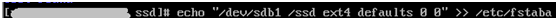 # echo "/dev/sda1 /ssd ext4 defaults 0 0">>/etc/fstaba