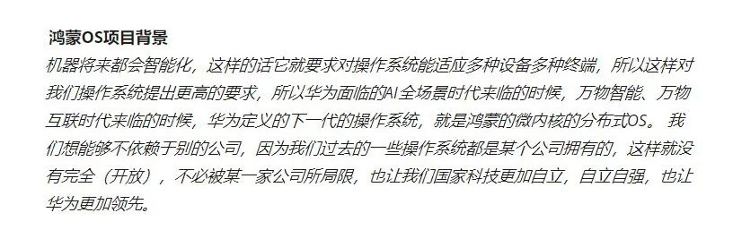这一点从鸿蒙OS的项目背景上,就可以看出端倪:“机器将来都会智能化,这样的话它就要求对操作系统能适应多种设备多种终端,所以这样对我们操作系统提出更高的要求,所以华为面临的AI全场景时代来临的时候,万物智能、万物互联时代来临的时候,华为定义的下一代的操作系统,就是鸿蒙的微内核的分布式OS......”