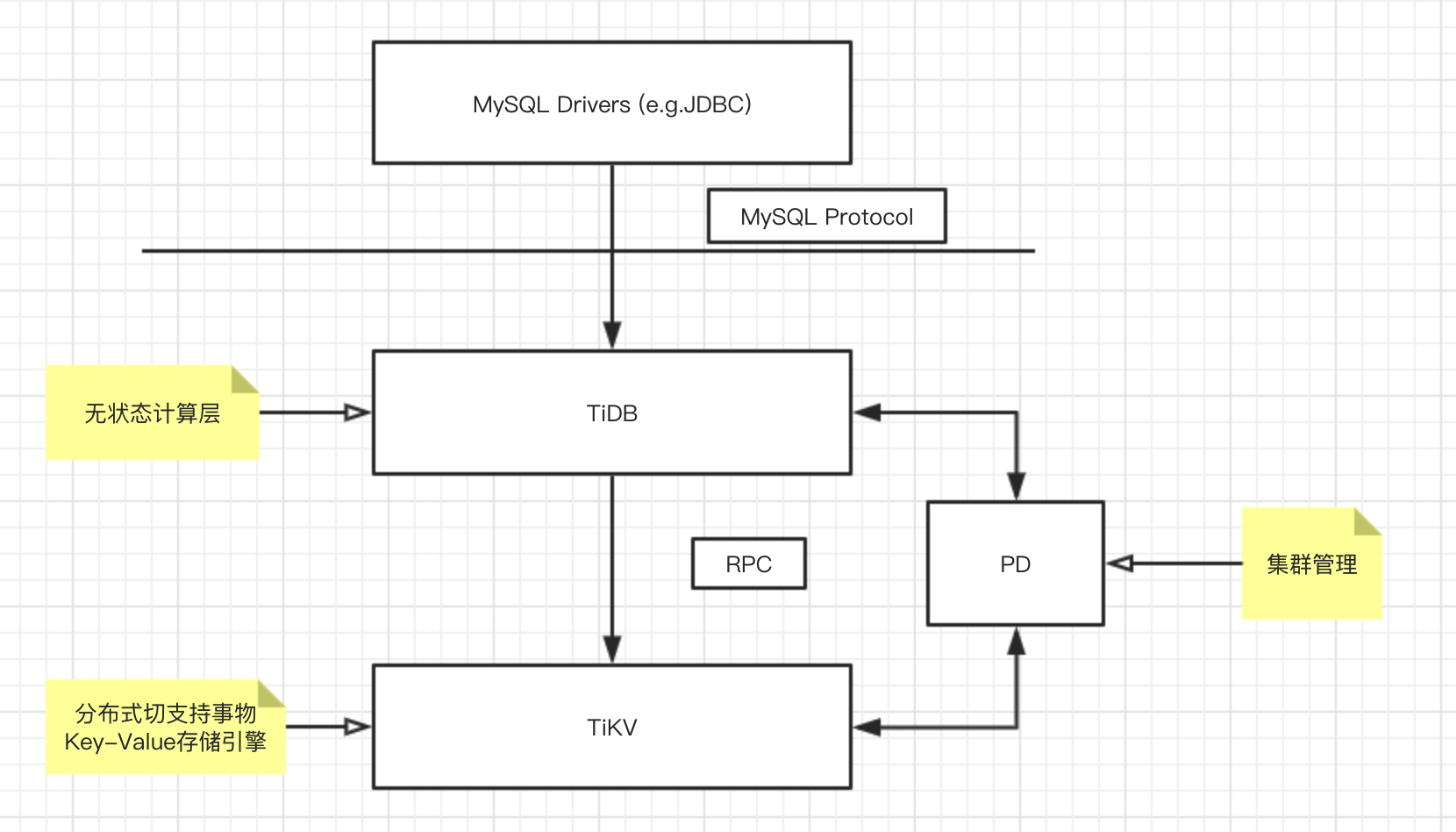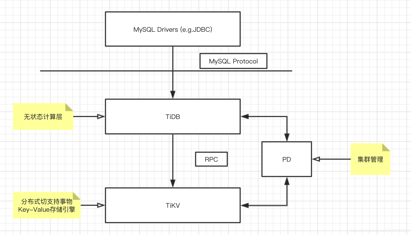 TiDB Server 负责接收 SQL 请求,处理 SQL 相关的逻辑,并通过 PD 找到存储计算所需数据的 TiKV 地址,与 TiKV 交互获取数据,最终返回结果。TiDB Server 是无状态的,其本身并不存储数据,只负责计算,可以无限水平扩展。