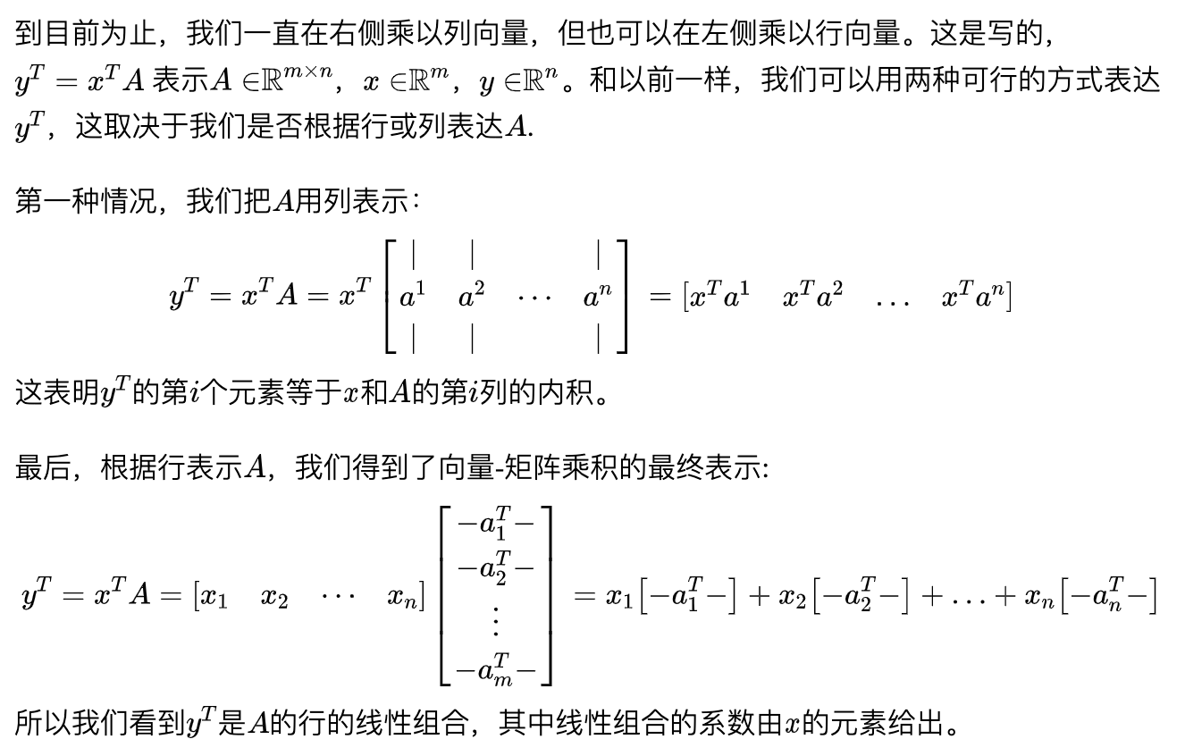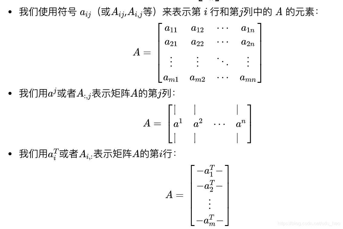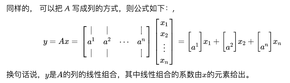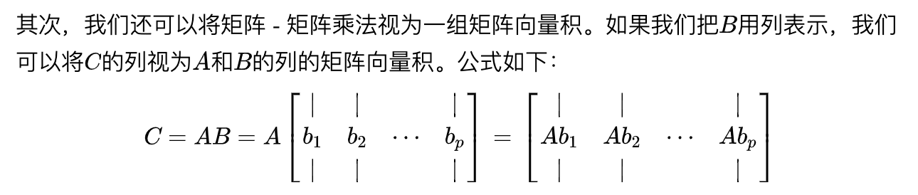 在许多情况下,将矩阵视为列向量或行向量的集合非常重要且方便。 通常,在向量而不是标量上操作在数学上(和概念上)更清晰。只要明确定义了符号,用于矩阵的列或行的表示方式并没有通用约定。