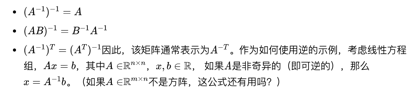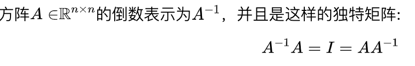 请注意,并非所有矩阵都具有逆。例如,非方形矩阵根据没有逆的定义。然而,对于一些方形矩阵A,可能仍然有不存在逆矩阵